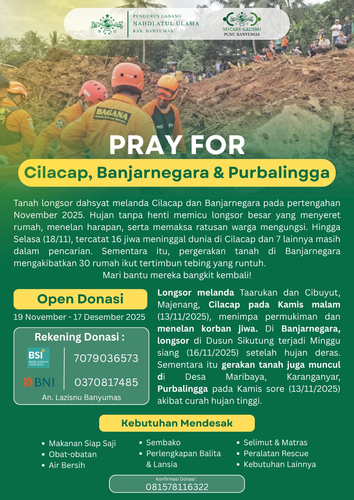 Banyumas, lazisnubanyumas.com– Lembaga Amil Zakat, Infak, dan Sedekah Nahdlatul Ulama (LAZISNU) PCNU Kabupaten Banyumas berhasil menghimpun donasi kemanusiaan untuk membantu penanganan bencana alam di wilayah Provinsi Jawa Tengah, Sumatra, dan Aceh. Ketua LAZISNU PCNU Kabupaten Banyumas, Prof. Dr. H. Suwito, M.Ag., menyampaikan bahwa penggalangan dana ini menjadi wujud solidaritas warga Nahdlatul Ulama (NU) bersama masyarakat,…